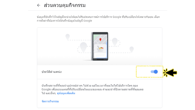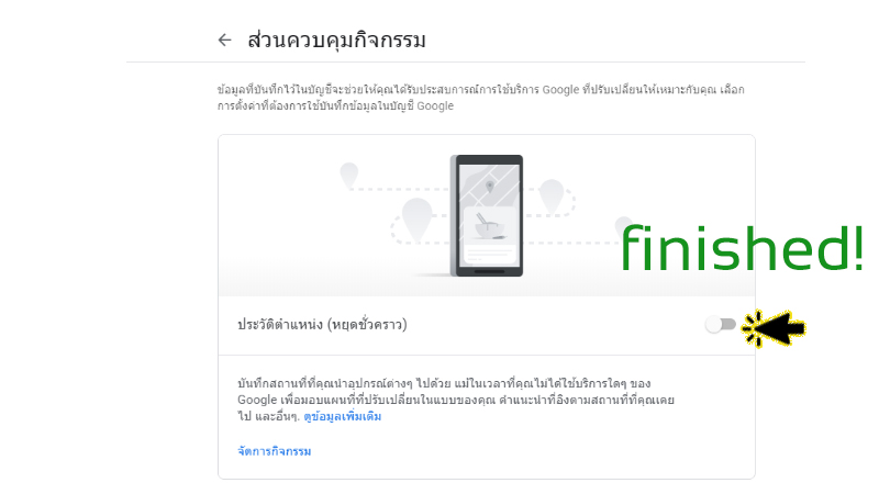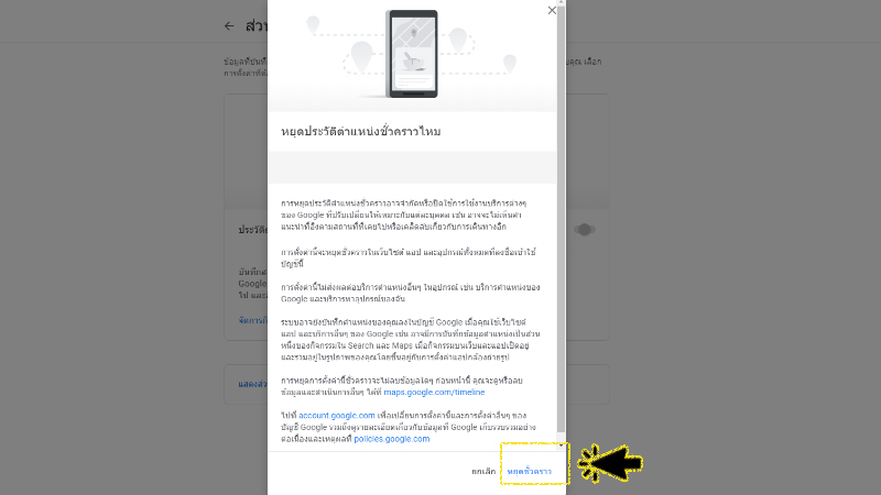 - การหยุดการตั้งค่านี้ชั่วคราวจะไม่ลบข้อมูลใดๆ ก่อนหน้านี้ คุณจะดูหรือลบข้อมูลและดำเนินการอื่นๆ ได้ที่ maps.google.com/timeline